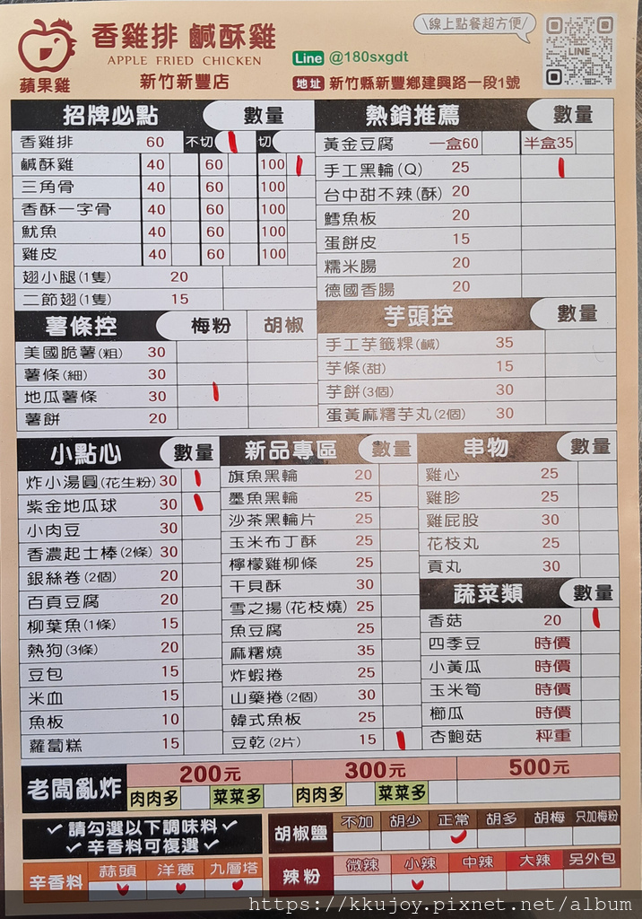 | 蘋果雞鹽酥雞 ■ 怎麼去 ■2025菜單 ■NT60香雞排 ■NT40 60 100鹽酥雞 ■香菇 ■地瓜薯條 ■炸小湯圓 ■紫金地瓜球 ■豆干(2片) ■手工黑輪 |